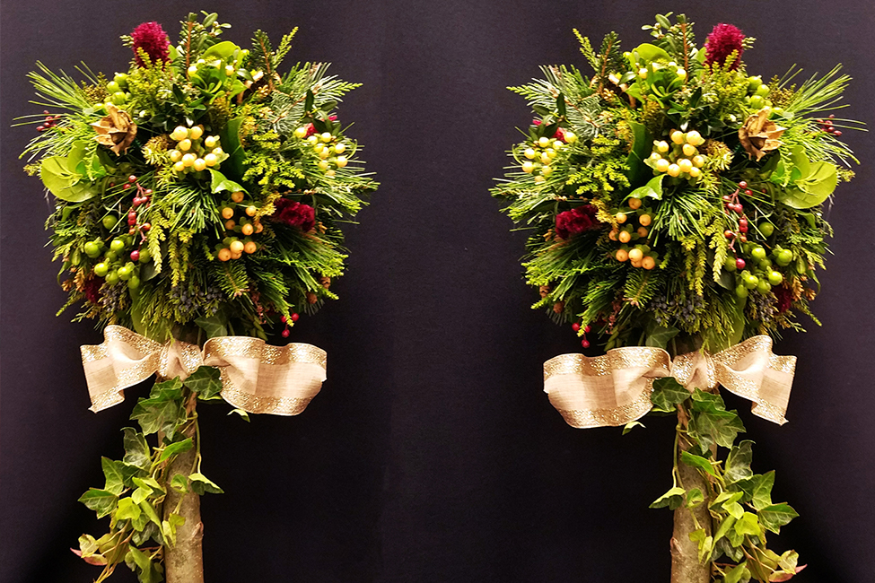 Create a 2-foot tall, round topiary using fresh-cut greens, including boxwood, variegated fan arborvitae, cedar, and juniper with blue berries. Decorate with an assortment of hand-colored dried botanicals—hydrangea, herbs, pods, roses, nuts, and more—to suit your personal style. Your topiary will stay fresh throughout the holiday in a terra-cottapot. Bring a box to transport your creation home.