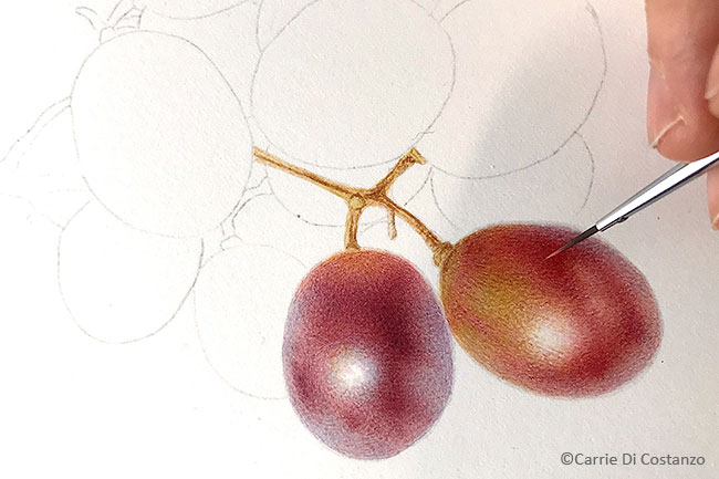 This workshop will impart the instructor's method of using dry brush watercolor to replicate the colors, form, and texture of luscious red grapes. The demonstration will include color mixing, working light to dark, layering colors, adding fine detail, using dry brush, and glazing. Some painting experience is recommended.