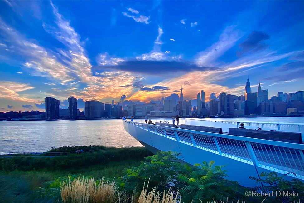 Hunters Point South Park, once a barren post-industrial site, has emerged as an international model for resilient waterfronts that is both urban and other-worldly. Designed by world-renowned landscape architect Tom Balsley, FASLA, this park embraces the shoreline of NYC's east river, leveraging its peninsulas into a unique waterfront experience that provides visitors with shifting perspectives as they wander in and out.