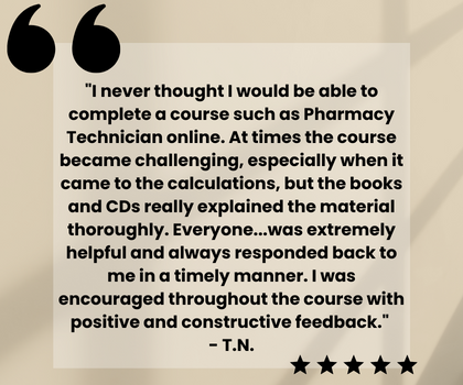 Pharmacy technicians assist and support licensed pharmacists in providing healthcare to patients. Jump start your career towards working as a Pharmacy Aide, Pharmacy Technician, Certified Pharmacy Technician, Health Technician/Technologist, Medical Laboratory Technician, Medical Records Clerk/Technician, or a Nursing Assistant. You will get hands-on practice in retail pharmacy procedures through an online lab module. You will also have the opportunity to apply for a 100+ hour externship.